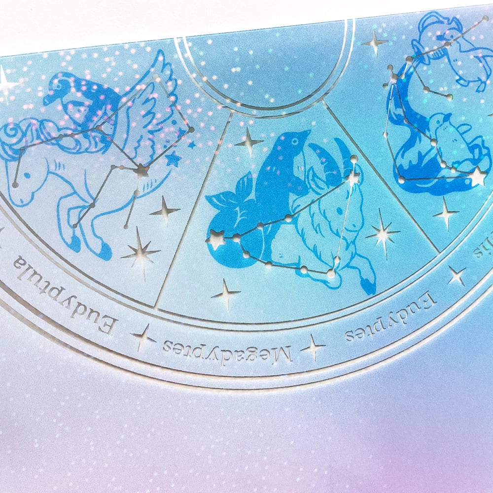 オーロラカラーがかわいいミニクリアファイル。A5サイズです。 星座をモチーフにしたペンギンのイラストが描かれています。 全面ホログラム加工で、角度によってきらきらと光を反射します。 チケットやメモ類の整理にもぴったりなサイズ感です。 - - - - - - - - - - - - - - - - - - - - 商品:A5クリアファイル サイズ:横 154mm x 縦 218mm × 厚さ 0.2mm 素材:PP(ポリプロピレン)